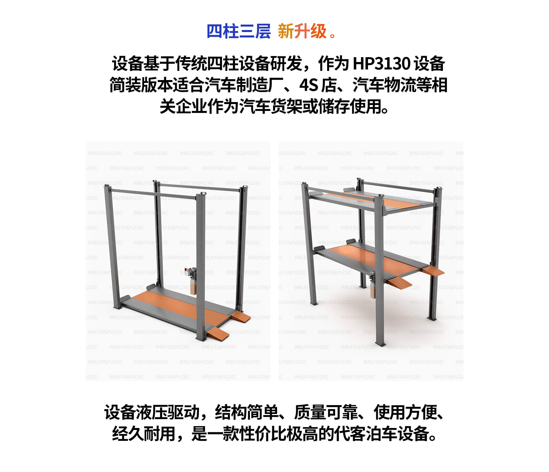 四柱系列HP3130系列產(chǎn)品是由我司研發(fā)生產(chǎn)的簡易類疊板停車設(shè)備。設(shè)備在過去10年中行銷歐、美等發(fā)達(dá)國家,累計銷售2000余臺。